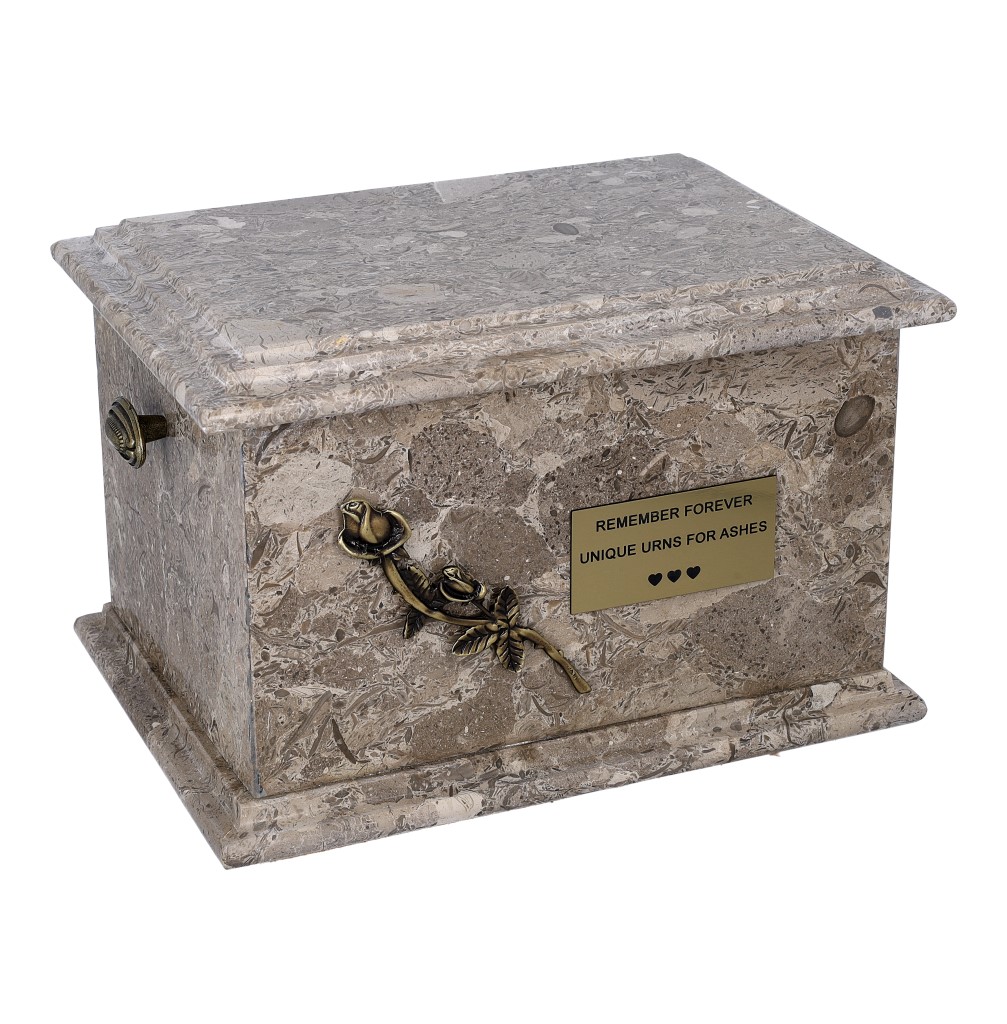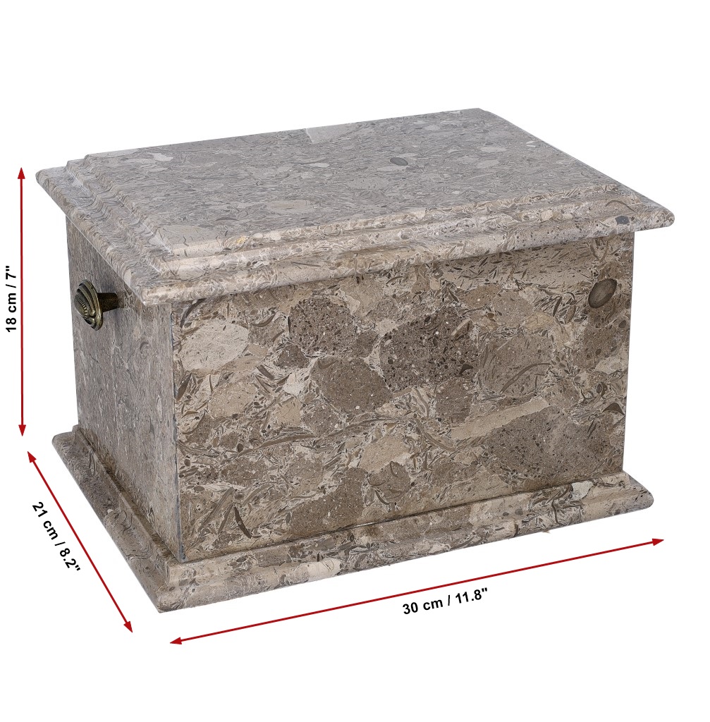 Ta elegancka urna kremacyjna została wykonana z naturalnego kamienia oceanicznego, wyjątkowego rodzaju marmuru bogatego w widoczne skamieniałości oraz delikatne, organiczne żyłkowania. Każdy egzemplarz posiada niepowtarzalną strukturę, dzięki czemu urna jest jedyna w swoim rodzaju i podkreśla indywidualny charakter miejsca pamięci.